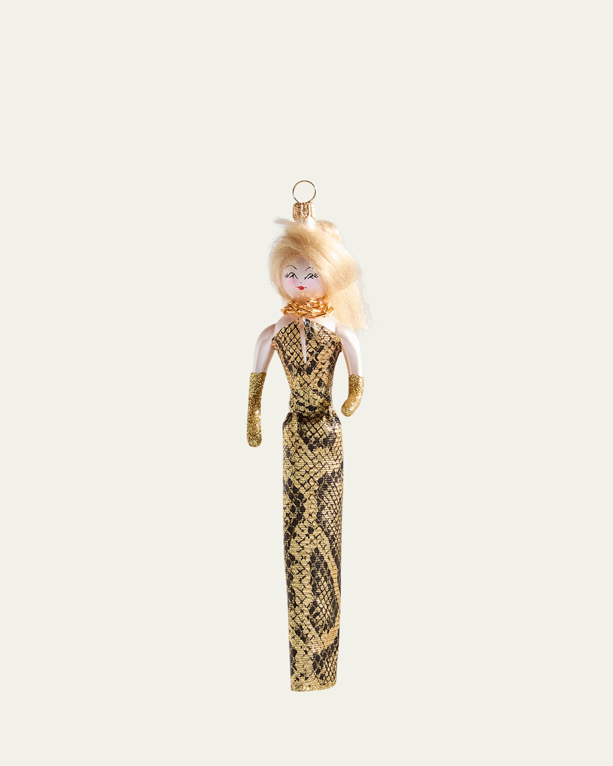 Fashionista ornament dressed in a snakeprinted gown with a golden chain necklace Handcrafted of glass, polyester ribbon, nylon and aluminum Approx. 1.6"L x 1.2"W x 6.3"T Made in Italy