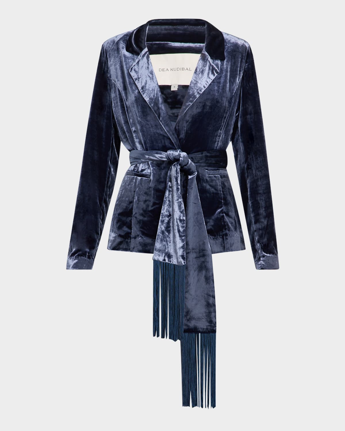 Dea Kudibal "Malva" velvet jacket featuring a selfwrap belt with fringed ends Approx. 25.6"L from shoulder to hem Notch lapels; singlebreasted front Long sleeves; approx. 24.8"L Side welt pockets Slim fit Button closure Viscose/silk/elastane Professional cleaning recommended Imported