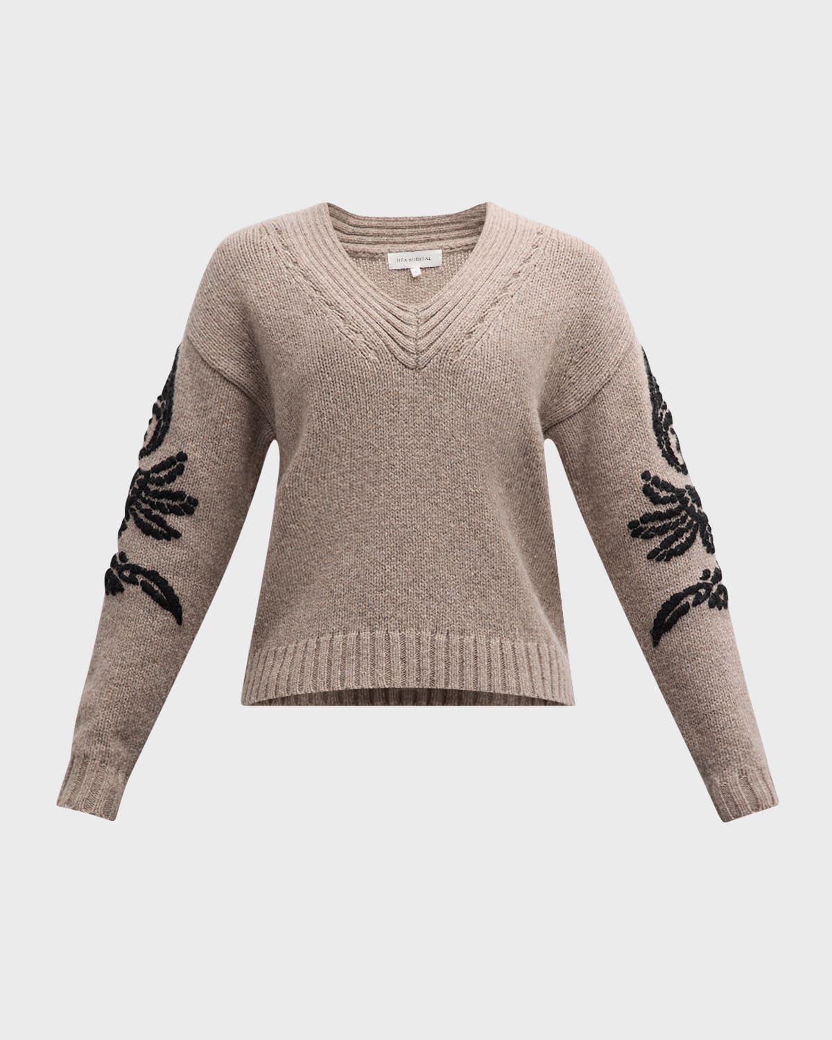 Dea Kudibal "Pippa" knit sweater with paisley embroidery Approx. 23"L from shoulders to hem V neckline Drop shoulders Long sleeves; approx. 20.5"L Relaxed fit Pullover style Wool/nylon/polyamide Hand wash Imported