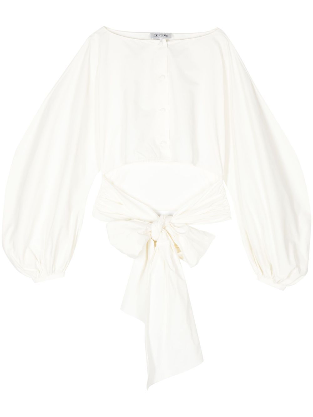 off-white poplin texture boat neck front button fastening fabric-covered buttons long batwing sleeves gathered buttoned cuffs cut-out detailing tied waist