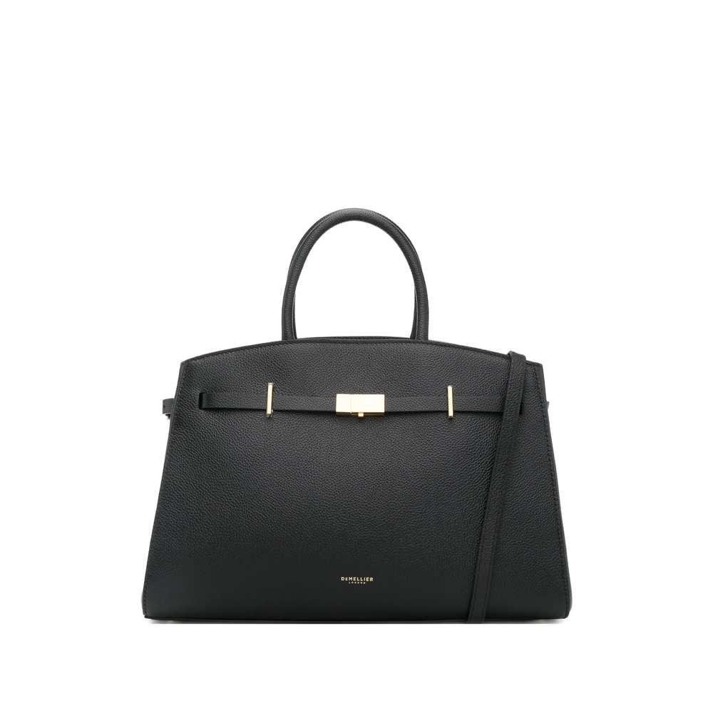 black grain leather two top handles gold-tone clasp adjustable detachable shoulder strap