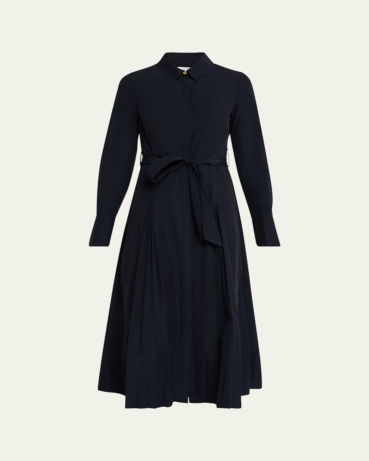 Derek Lam 10 Crosby "Annette" pleated shirtdress Approx. 33"L from shoulder to hem Spread collar; concealed placket Long sleeves; button cuffs Selftie belt through belt loops Yoked back Hem falls below the knee Aline silhouette Polyester/cotton Unlined Dry clean Imported