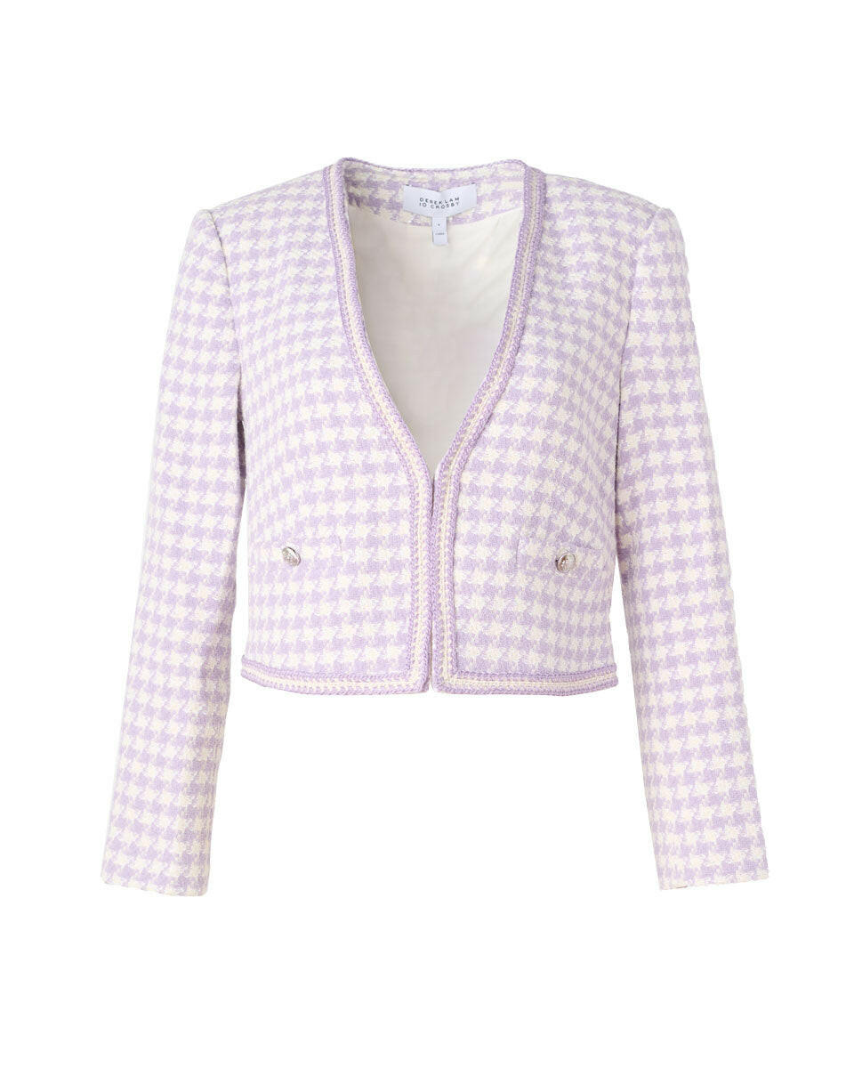 *FINAL SALE* The Astrid V-Neck Crop Jacket in Lavender and Ivory by Derek Lam 10 Crosby is a collarless, v neck jacket featuring a kissing hook and eye front closure, soft shoulder pads, and decorative crochet trim crafted in a multi colored houndstooth tweed. 70% Cotton 21% Polyester 5% Other Fibers 4% Acrylic Lining: 100% Polyester