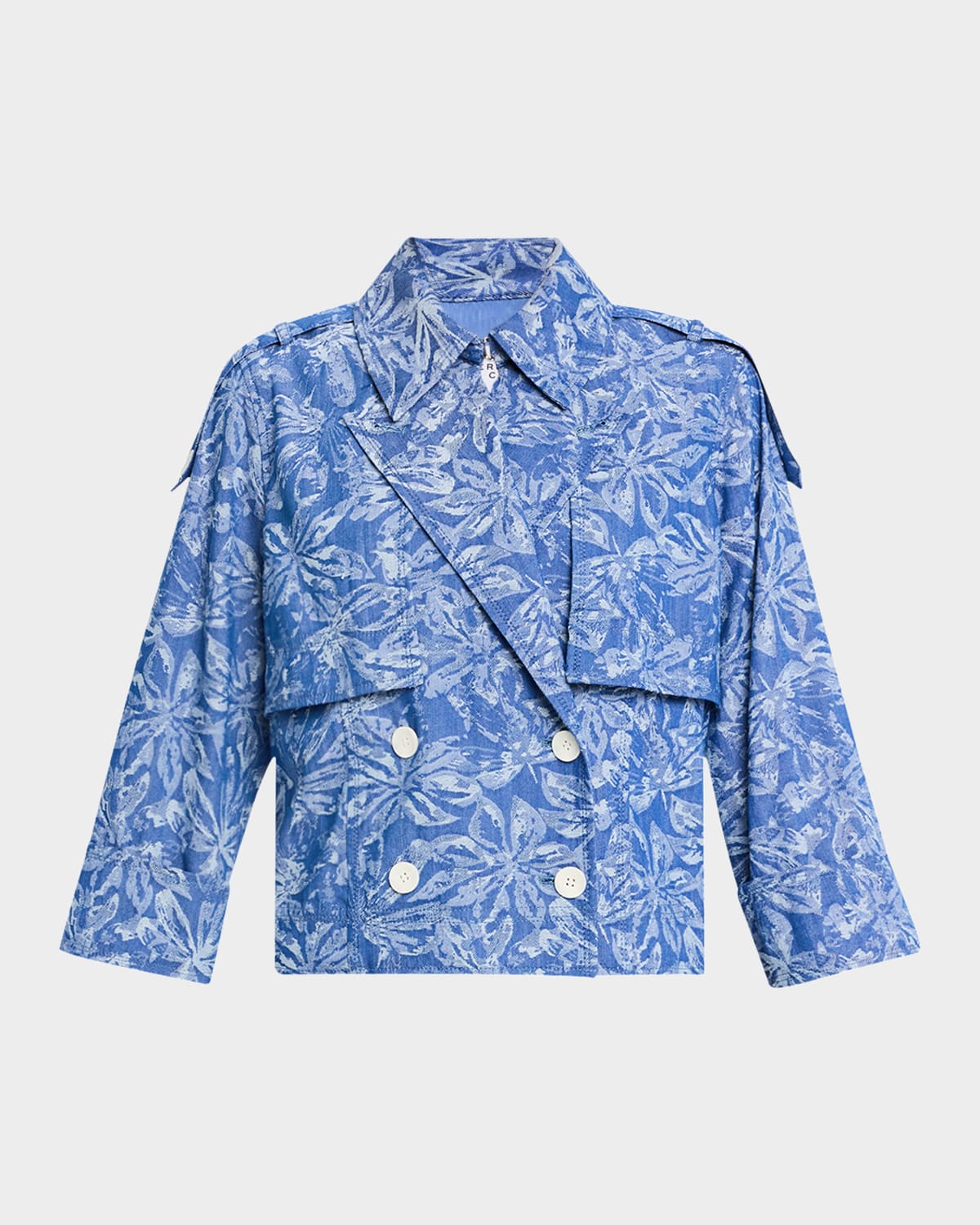 Derek Lam 10 Crosby "Elijah" trench jacket in floral jacquard Approx. 22"L from shoulder to hem Trench collar with throat latch; doublebreasted front Bracelet sleeves Chest gun flaps; inverted pleat rain shield back Shoulder epaulets Straight fit Hip length Button closure Cotton/polyester/elastane Unlined Dry clean Imported