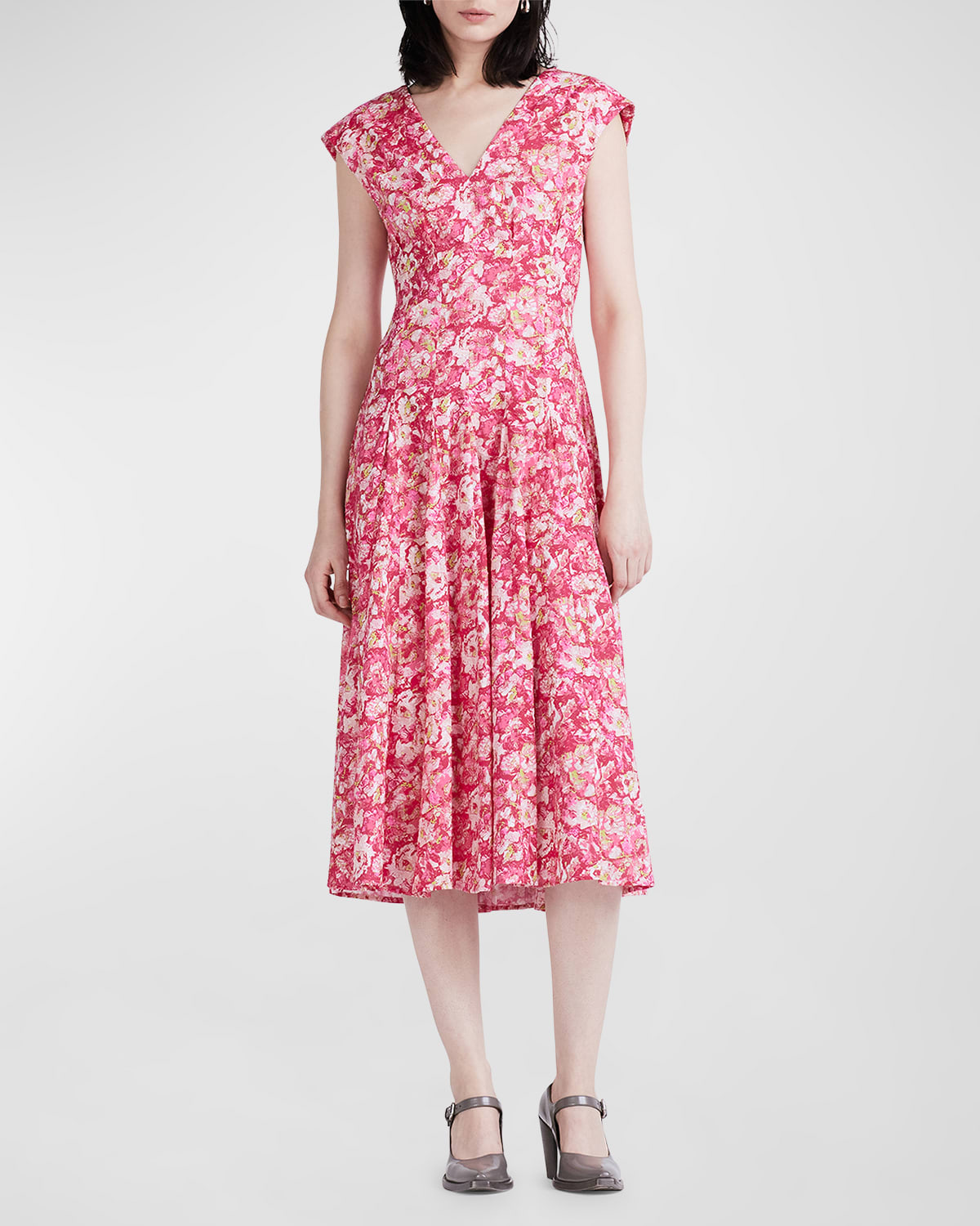 Derek Lam 10 Crosby "Ella" fullskirted dress in Vermillion print with vertical darts throughout Approx. 50.5"L from shoulder to hem V neckline Cap sleeves Fitted waist Hem falls below the knee Aline silhouette Center back zipper Cotton Dry clean Imported