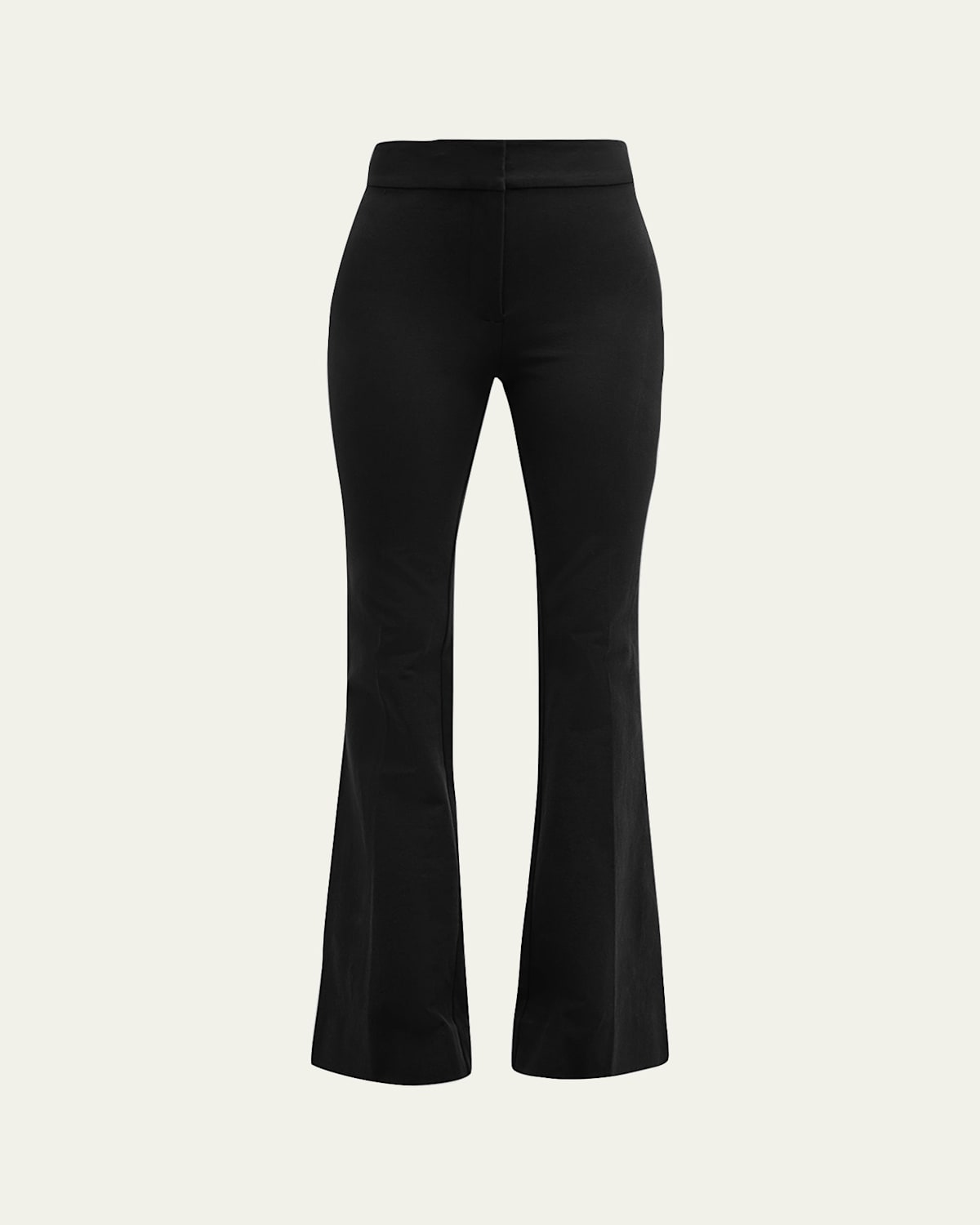 Derek Lam 10 Crosby crepe trousers. Approx. measurements: 9" rise; 34" inseam; 43" outseam. Midrise; concealed hook/zip fly. Back besom pockets. Slim fit; flared legs. Cotton/acrylic/nylon/polyester. Dry clean only. Imported.