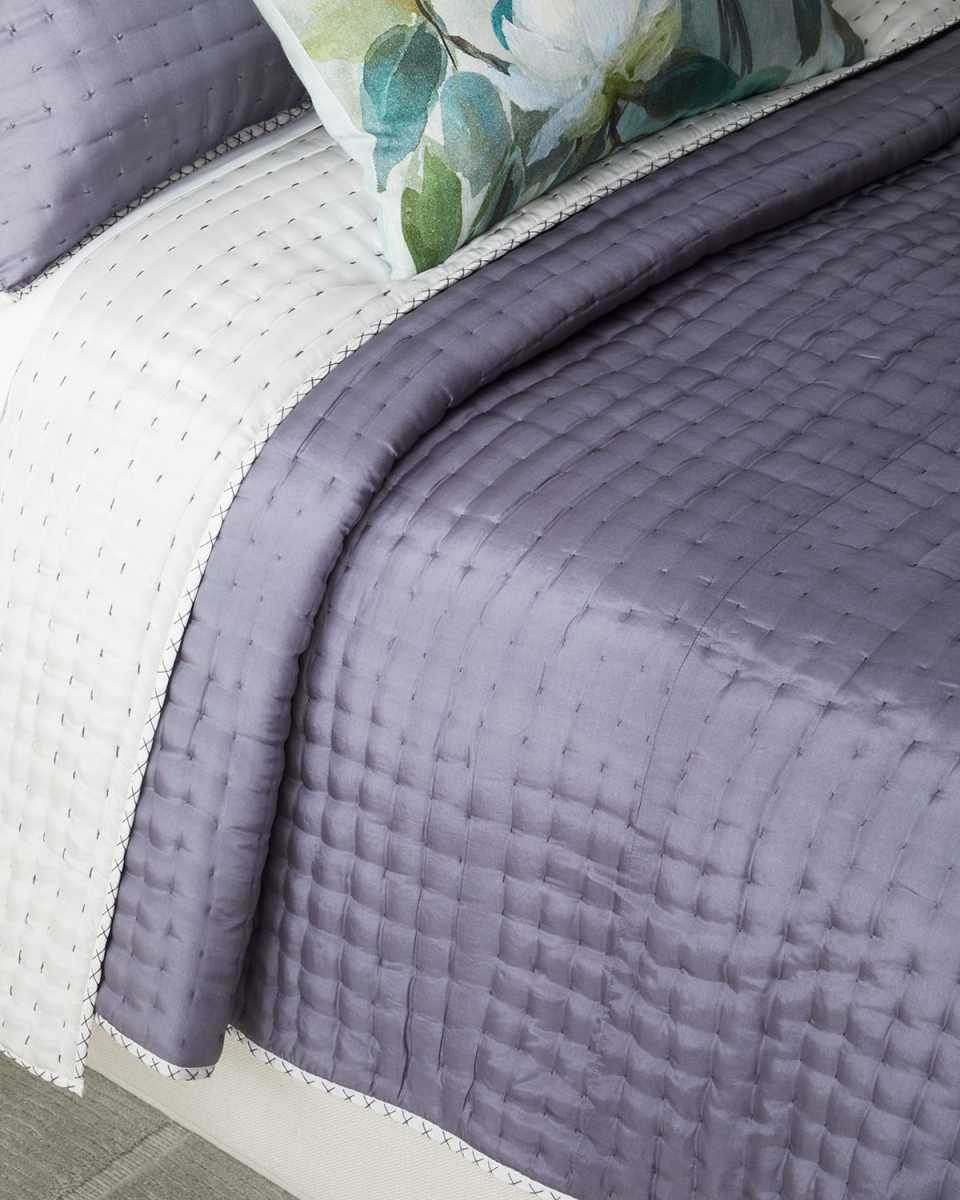 Luxuriously soft and lightweight 100% silk quilt in a fresh chalk white with a reverse of graphite grey. Handquilted and finished with a contrast cross stitch detail makes for a sophisticated complement to any bedroom Polyester padding Approx. 91" x 91" Dry clean Imported