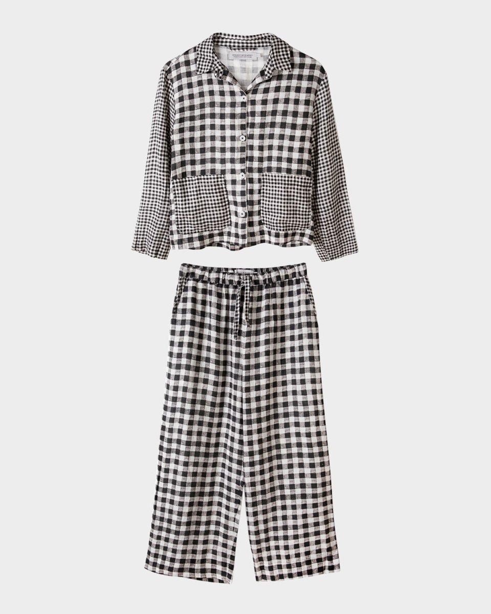 Desmond amp; Dempsey pajama set in ginghamprint linen Approx. 23.5"L from shoulders to hem Spread collar; button front Long sleeves Front patch pockets Relaxed fit Includes matching pants Elasticized drawstring waistband Side slant pockets Cropped at the ankle Wide legs Pullon style Cotton Made in Portugal