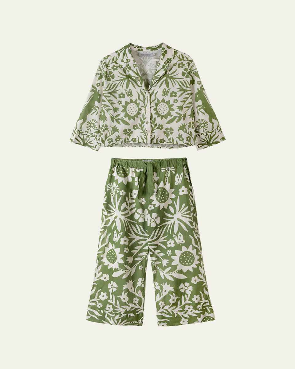 Decorated in twotone botanical print, this Desmond amp; Dempsey lounge set features sharp tailoring and a cropped body Approx. 20.8"L (XS) 25.2"L (XXL) from shoulder to hem Notched collar; button front Threequarter sleeves Boxy fit Includes matching pants Drawstring waistband Wide legs Pullon style Organic cotton Imported