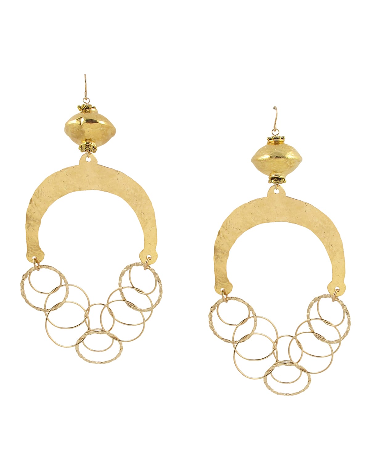 Devon Leigh wedge chandelier earrings. 18karat yellow gold plated hardware. Nepalese bead and hammered wedge. 24karat gold electroplated chains. 14karat gold filled ear wire. For pierced ears. Made in USA.