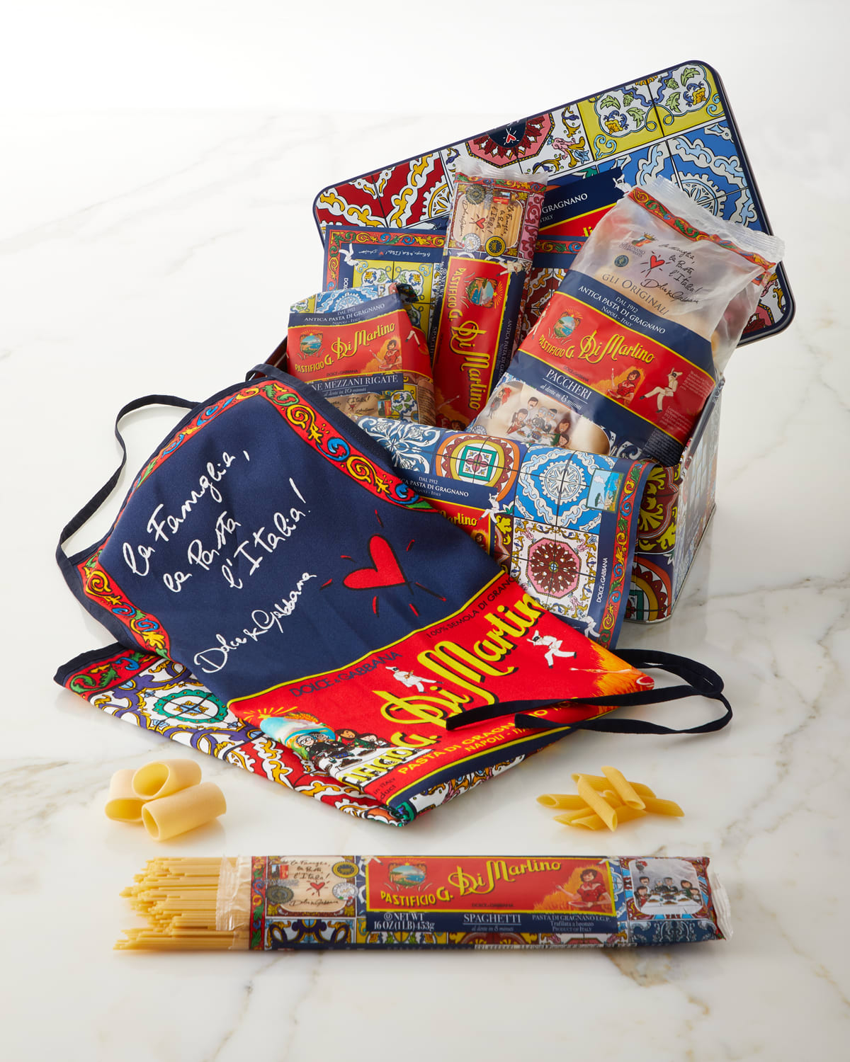 EXCLUSIVELY AT NEIMAN MARCUS Box set includes bags of spaghetti, paccheri, and penne mezzani rigate noodles wrapped in custom designed Dolceamp;Gabbana packaging. Includes tin and cotton apron (polyester trim). Spaghetti, 16 ounces. Paccheri, 17.6 ounces. Penne, 16 ounces. Tin: 14.1"W x 9.45"D x 5.3"T. Shelf life: 36 months. Made in Italy.