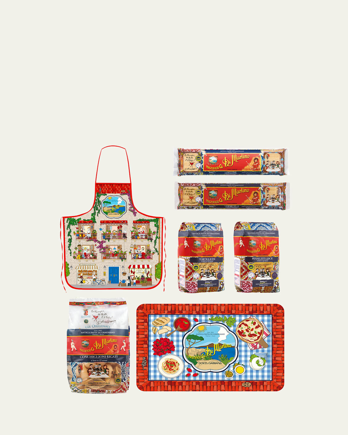 This joyful tin gift box opens the doors of the Italian houses and celebrates the conviviality of a typical laid table. It contains 5 shapes of IGP Gragnano Pasta made with 100% Italian durum wheat and a marvelous cotton apron designed by Dolceamp;Gabbana, being turned into a vivid and colorful Italian building. The Set Contains: Dolce amp; Gabbana apron, 2 packs of penne mezzani rigate pasta, 2 packs of spaghetti pasta, and 1 pack of trottole pasta Pasta shapes may vary according to availability Pasta shelf life: 2 years Total net weight: 144 oz. Made in Italy