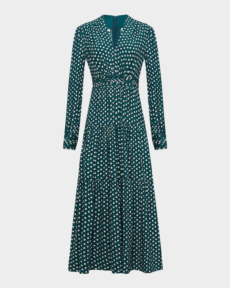 Diane von Furstenberg "Gil" tiered midi dress in a swirling polka dot print V neckline Long blouson sleeves Button cuffs Pintuck waist Hem falls below the knee Aline silhouette Invisible back zipper Viscose Dry clean Imported