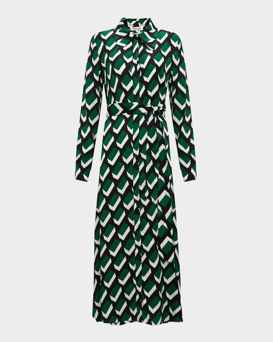 Diane von Furstenberg "Gizelle" midi shirtdress in a geometric print Spread collar; button front Long sleeves; button cuffs Ruched back yoke Waist selftie Hem falls below the knee Aline silhouette Viscose Imported