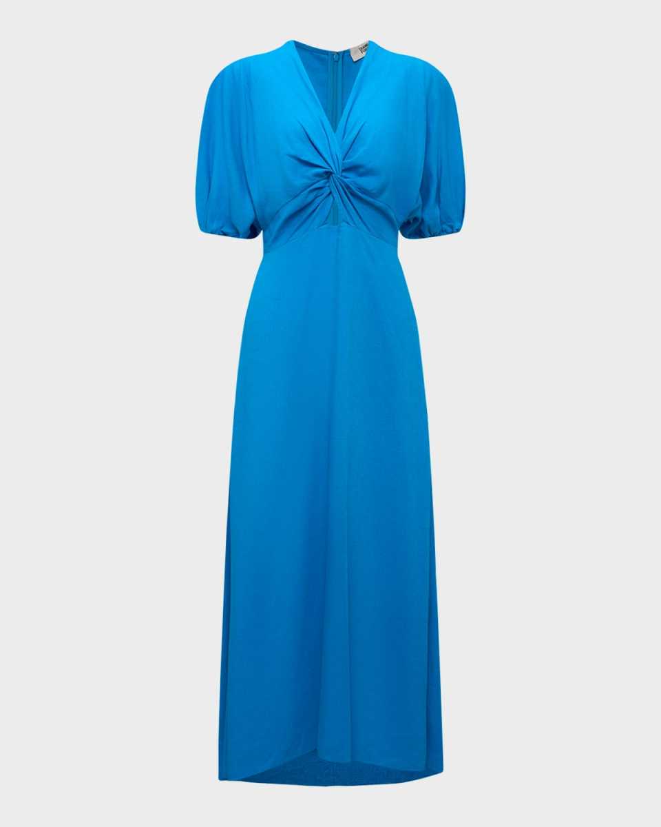 Diane von Furstenberg "Marjorie" midi dress in Ecovero viscose features a knotted front detailing Vneckline; keyhole front Short puff sleeves Side slip pockets Hem falls below the knee Aline silhouette Concealed back zip Viscose/linen Dry clean Imported