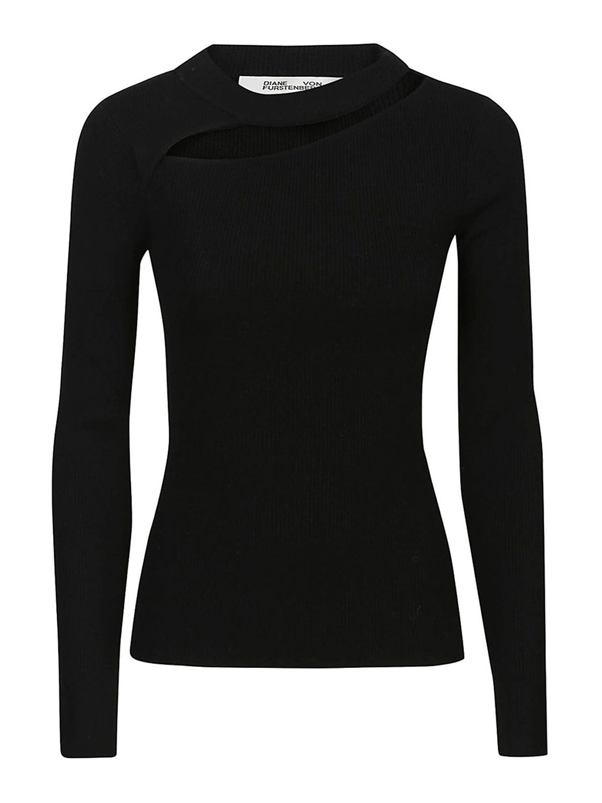 Top en laine noire de Diana von Furstenberg avec col rond, manches longues, découpe sur la poitrine.