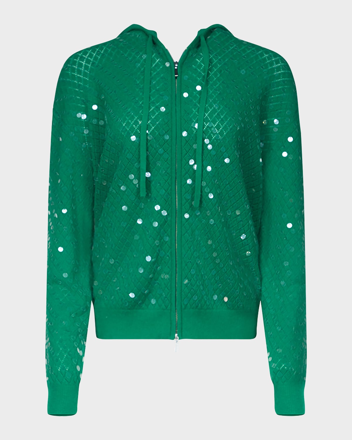 An elevated take on the classic piece, this Diane von Furstenberg x Henry Zankov "Marco" hoodie is finely knit with pointelle stitching and dotted with diagonal lines of sequins The capsule collaboration is a harmony between DVF's legendary prints and Zankov's distinctive visual language Drawstring hood Zip front closure Drop shoulders Long sleeves; approx. 22"L Ribbed cuffs and hem Relaxed fit Merino wool/cashmere Imported