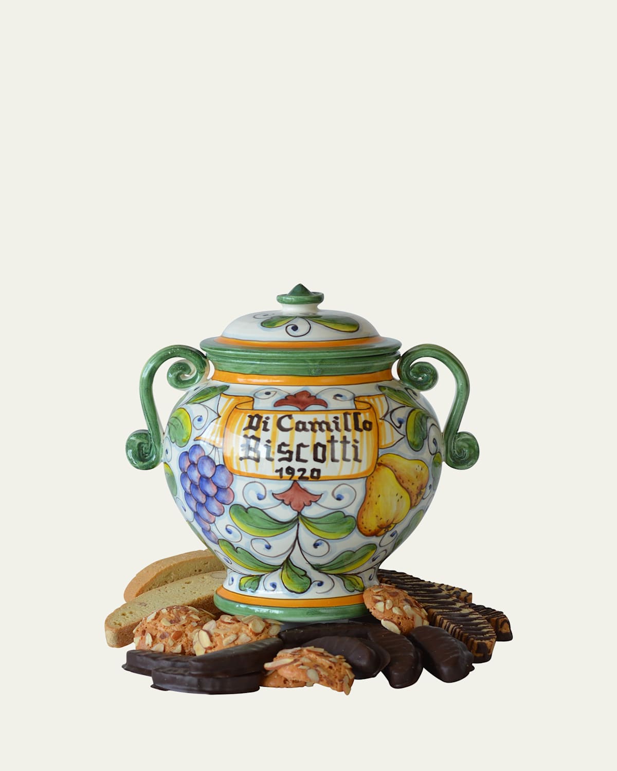 Biscotti jar filled to the brim with classic biscotti, amaretti, and chocolate cookie confections Contained in a handmade, handpainted ceramic jar with detailed fruit embellishment Approx. 6"L x 10"T Net. wt. 13 ounces Refrigerated shelf life: 6 months Made in USA