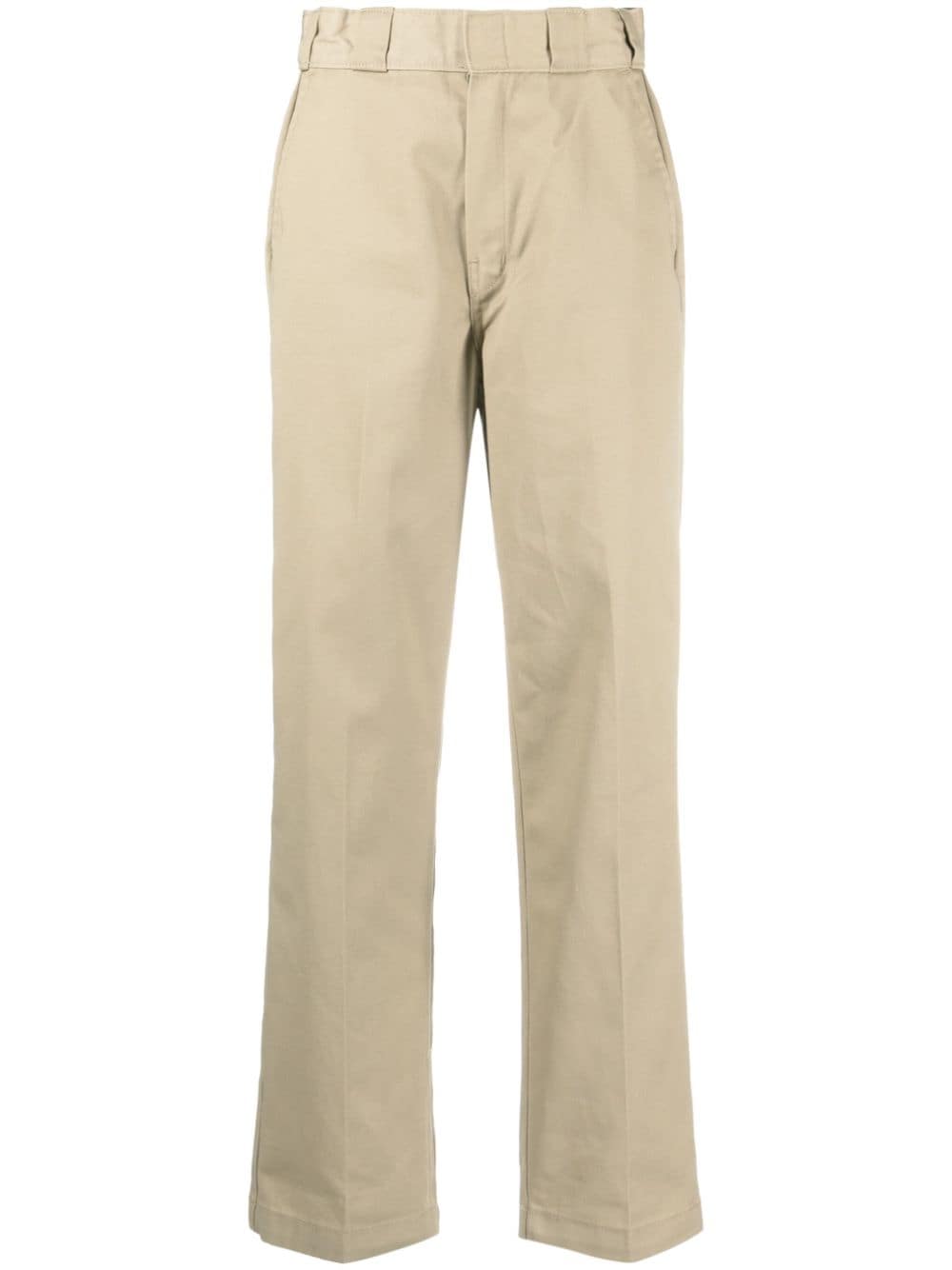beige twill weave logo patch to the rear mid-rise concealed front fastening two diagonal pockets to the sides two rear welt pockets straight leg