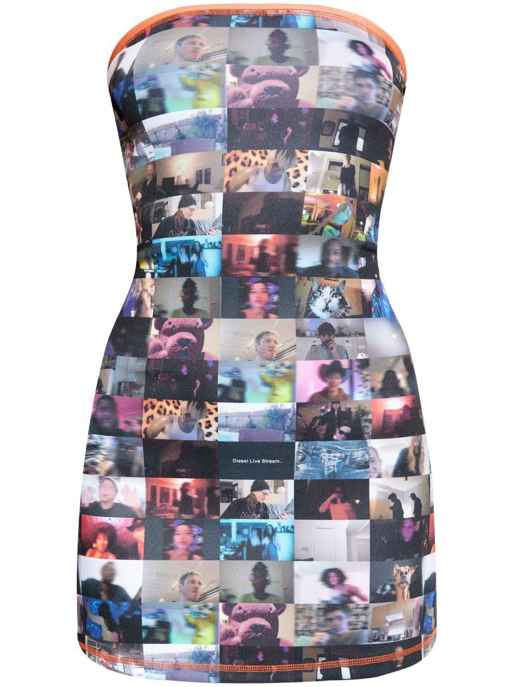 multicolour stretch-design slip-on style contrasting trim photograph print strapless straight hem thigh-length
