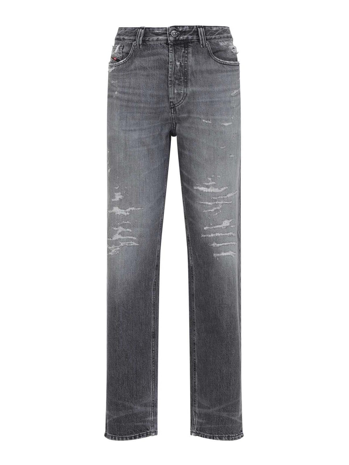 Diesel D, jean gris foncé confectionné en denim gris délavé, taille basse vieillie, passants de ceinture, design de poche, bouton dissimulé, étiquette de la marque à l'arrière de la taille, jambe droite