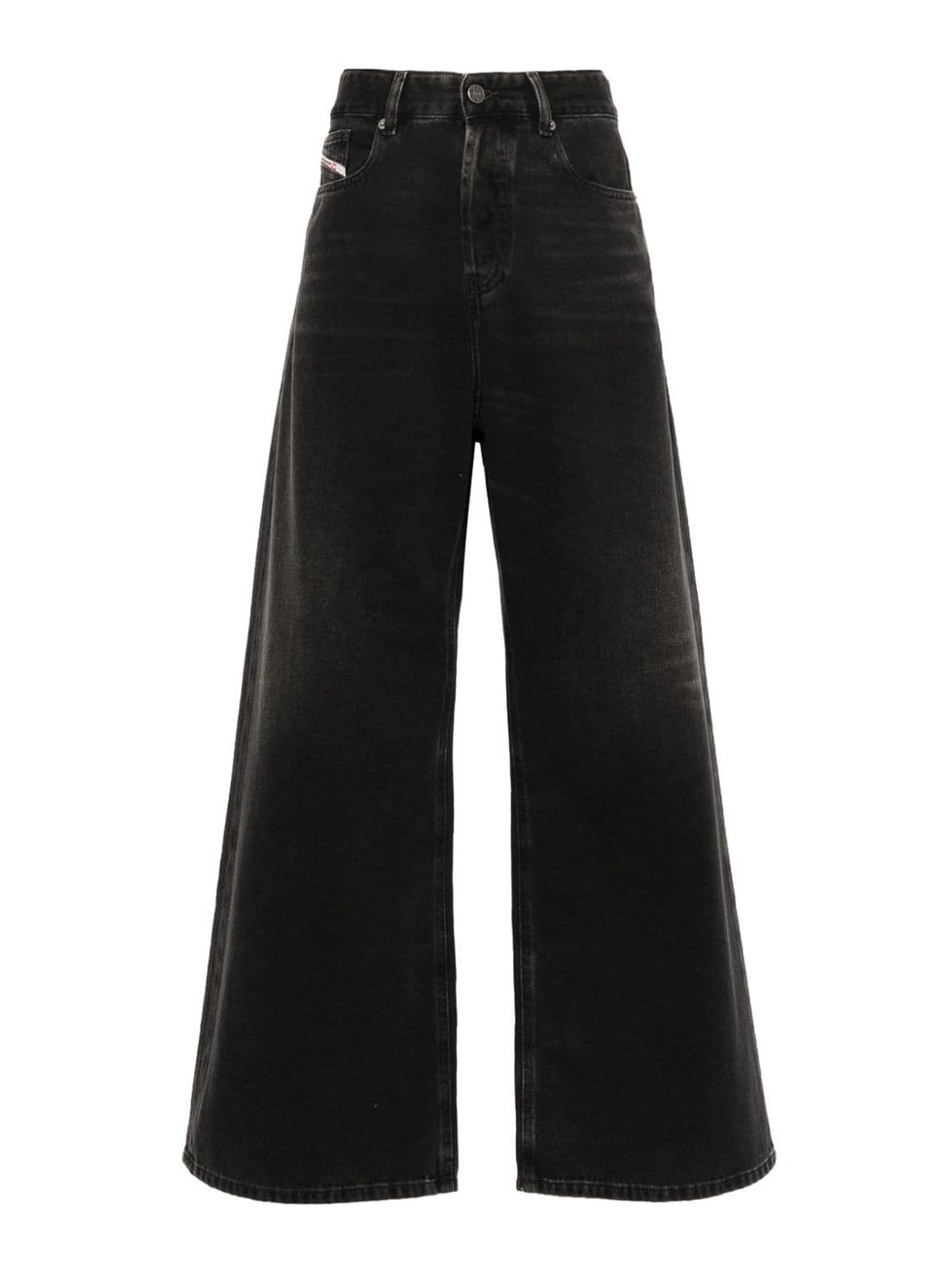 Passants de ceinture en denim noir à effet délavé, cinq poches classiques, écusson logo sur le logo, écusson à l'arrière, jambe large, braguette et bouton dissimulés