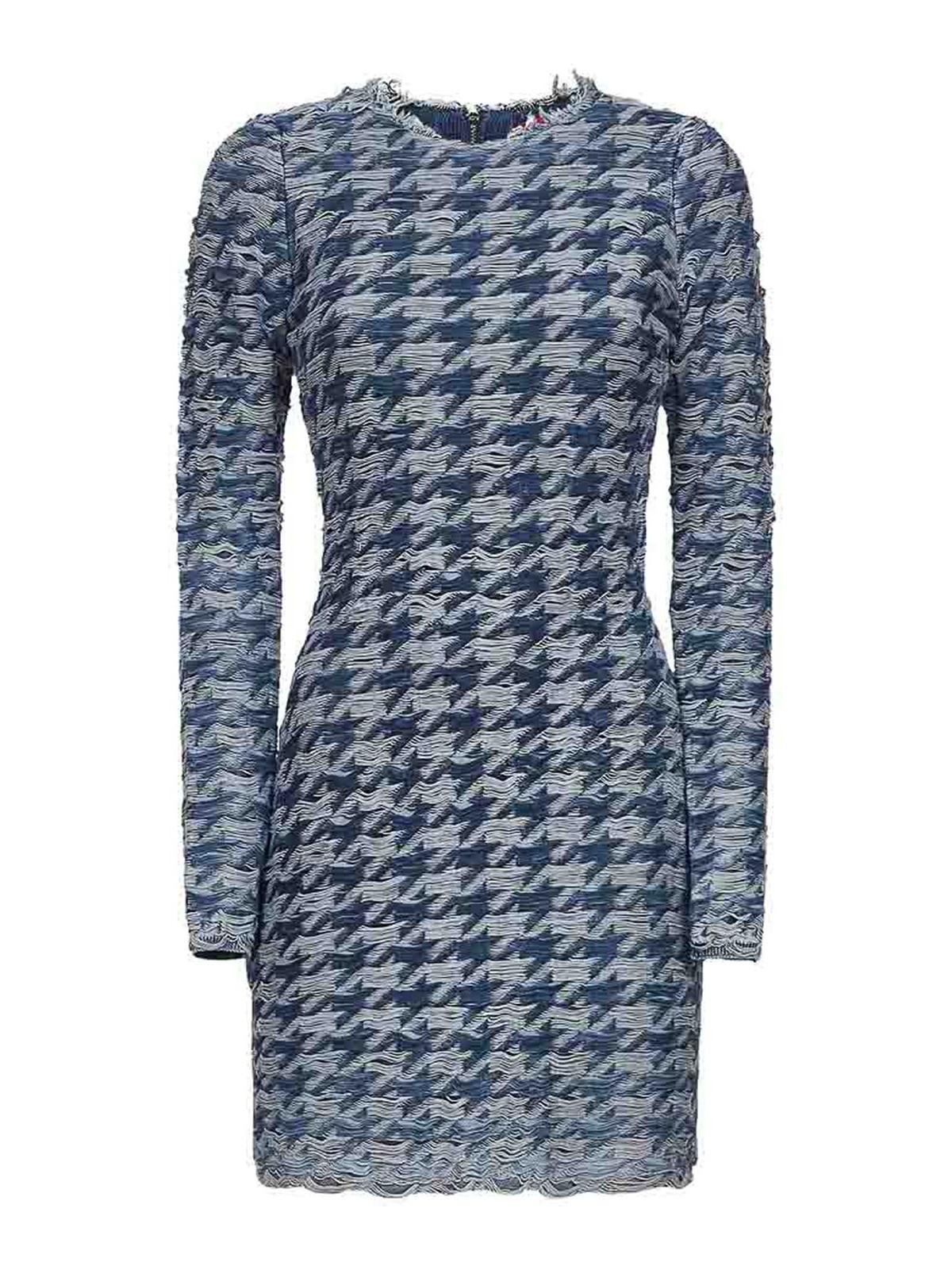 Motif pied-de-poule bleu clair, bords effilochés, manches longues, col rond, fermeture zippée.