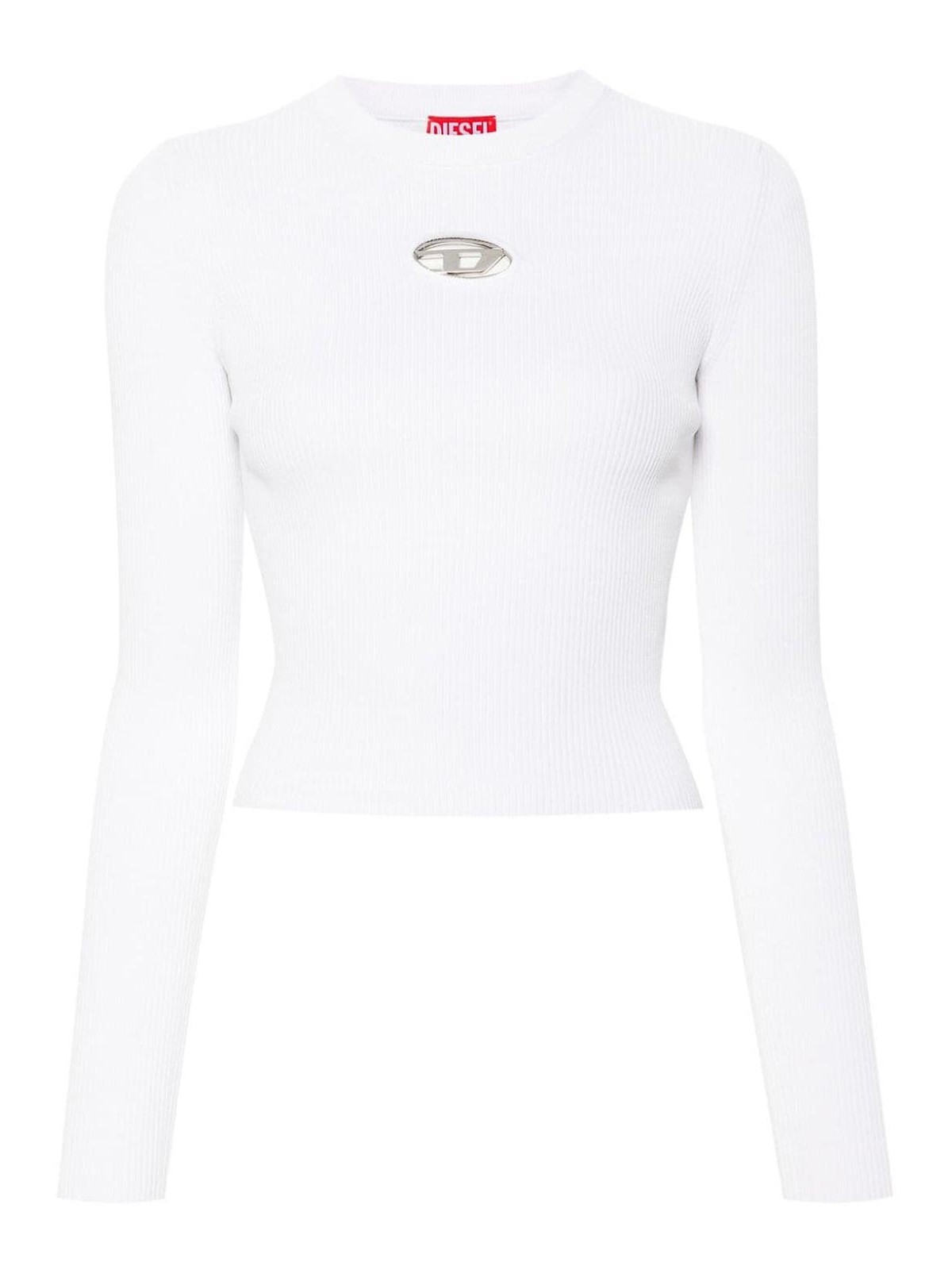 Top blanc de Diesel avec plaque logo ovale, design côtelé, col rond, manches longues, brut, ourlet découpé, Diesel, blanc, plaque logo, femmes