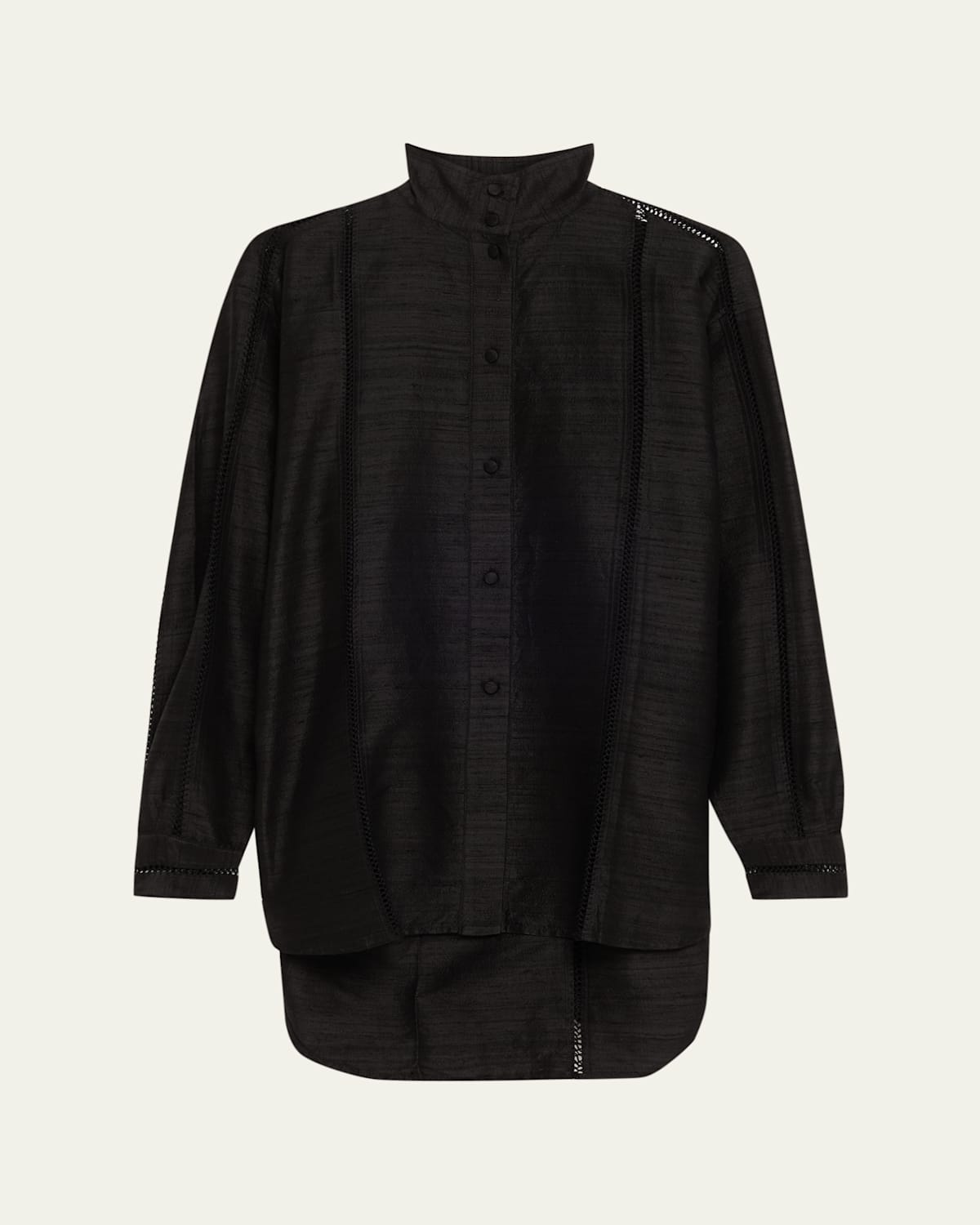 Designed in textured dupioni silk with a crisp hand and lustrous sheen, this shirt by Diotima features intricate openwork handstitched detailing Structured stand collar Long sleeves; tonal button cuffs Yoked back Relaxed fit Hip length Button front closure Silk Professional cleaning recommended Imported