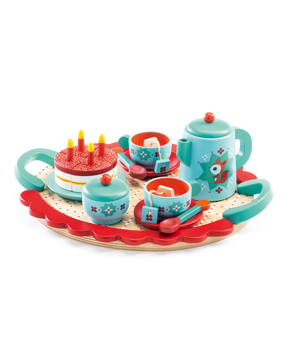 Djeco fox tea party role play set. Comes with two spoons, two cups, two small plates, one plate, one cake (4 slices) with four removable candles, two tea bags, one sugar bowl, one teapot, and one tray. The invitation for make believe lets little ones dream of the "me" they want to be! The role of chef, veterinarian, or salon owner are all explored with the quick switch of a play set. Made of sturdy, highquality wood painted in a beautiful, coordinating pattern. For ages 4 years and up. Imported.