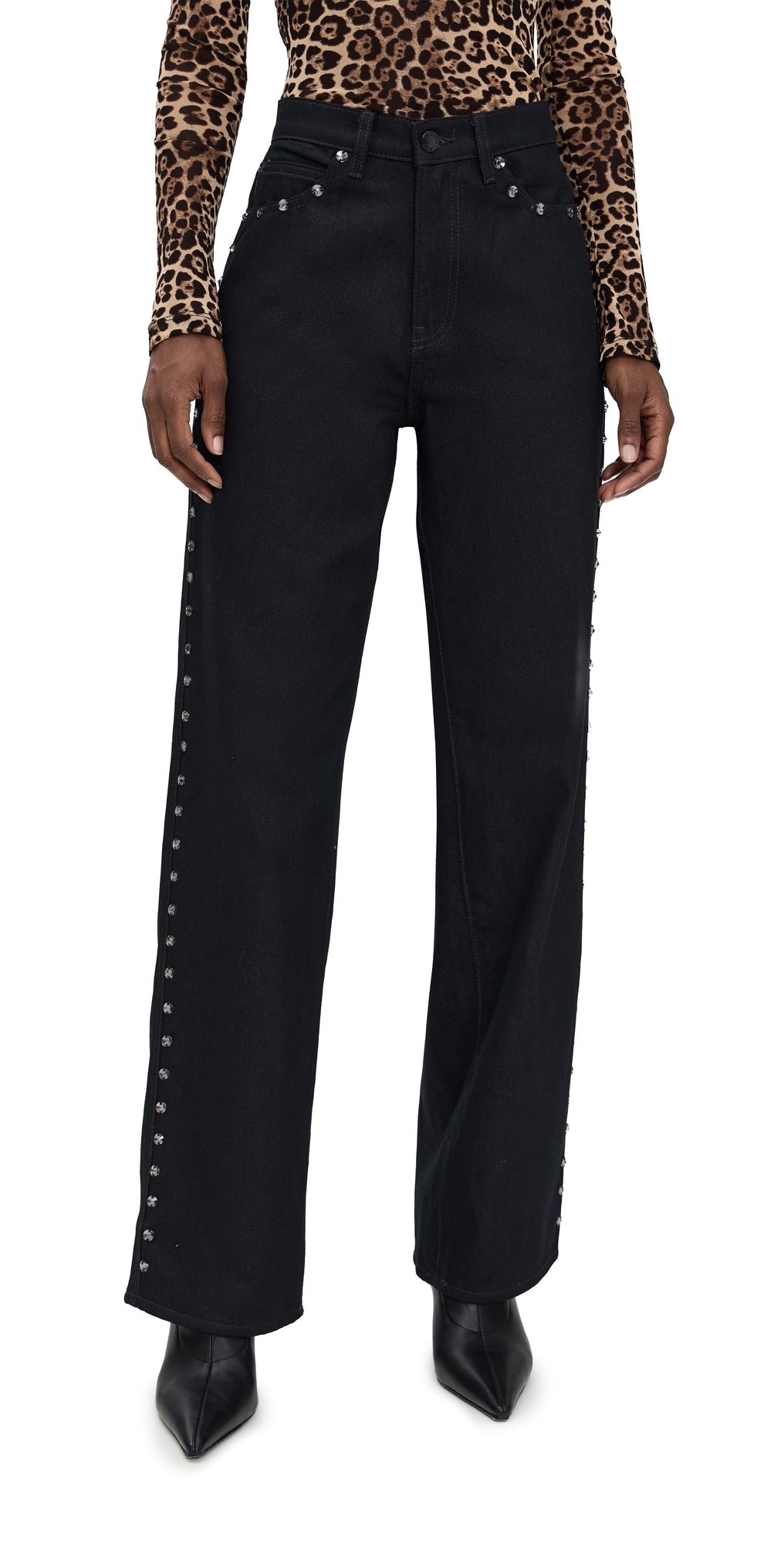 Fabric: Mid-weight, non-stretch denim. Rhinestone accent trim. Button closure and zip fly. 5-pocket styling. Shell: 100% cotton. Hand wash. Imported, Pakistan. Measurements: Measurements from size 25 Rise: 11.5in / 29cm Inseam: 32.25in / 82cm Leg opening: 19.75in / 50cm