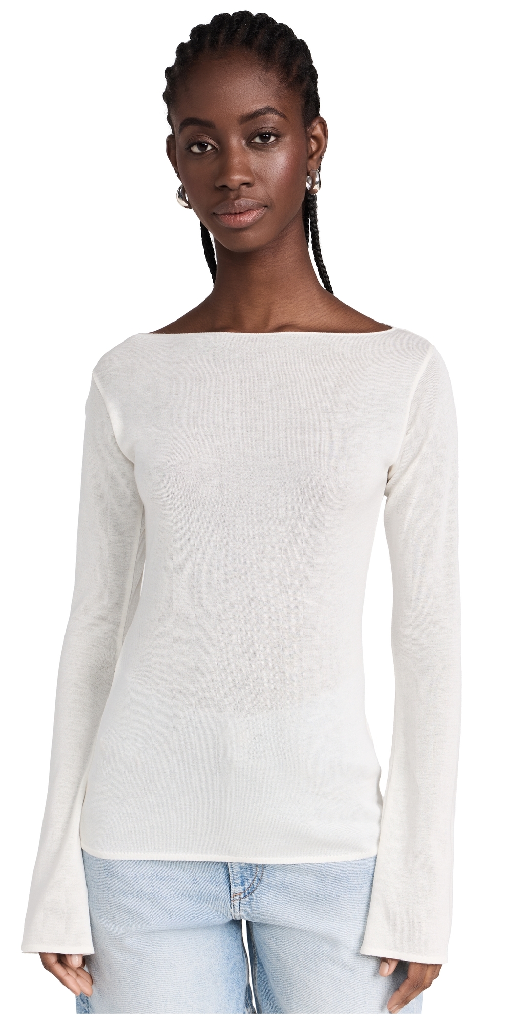 Fabric: Lightweight fine knit. Boat neck. Long sleeves. Shell: 80% viscose/20% wool. Wash cold. Made in Italy. Measurements: Measurements from size XS Length: 24.5in / 62.0cm, from shoulder