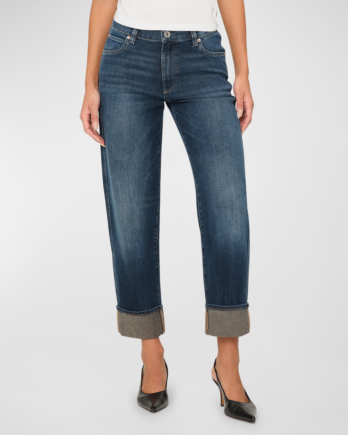 DL1961 "Thea" boyfriend jeans featuring a cuffed hem in darkwash denim Approx. 10" rise; 27" inseam Midrise; sits at the hip Fivepocket style Relaxed fit Cropped length Button/zip fly; belt loops Cotton/Lycra® spandex Machine wash cold Imported
