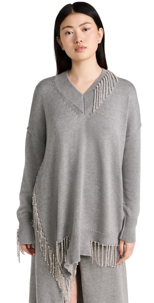 Fabric: Mid-weight knit. Crystal fringe trim. Crew neck and long sleeves. Distressed edges. Split hem. Shell: 54% polyester/20% acrylic/20% nylon/6% wool. Dry clean. Imported, China. Measurements: Measurements from size 40 Length: 29.5in / 75.0cm, from shoulder