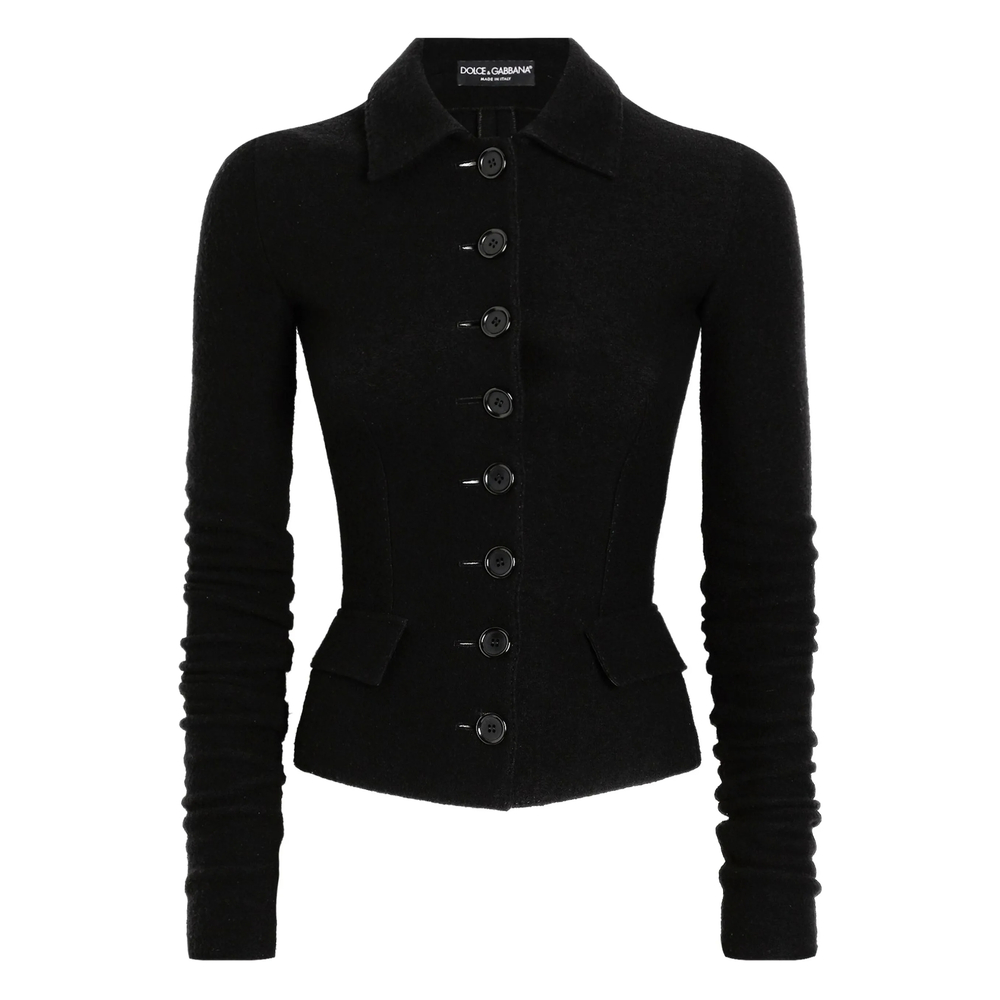 black button front fastening long sleeves flap pockets wool