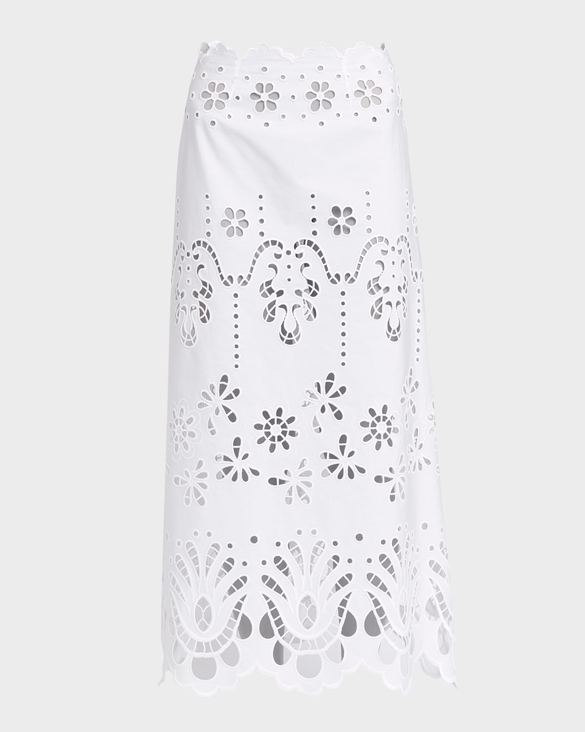 Dolceamp;Gabbana cotton poplin skirt featuring cutout embroidery and scalloped edges Mid waist Full length Aline silhouette Concealed back zip Cotton/polyester Made in Italy