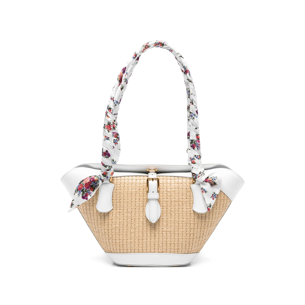 beige and white floral print handle buckle top handle This piece comes complete with a protective dust bag.