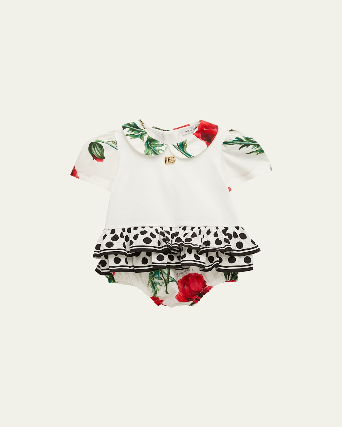Dolceamp;Gabbana mixed prints romper with gold signature logo at front Peter Pan neckline Short sleeves Snap closures at back Snap gusset Elasticized through legs Ruffle trim Bubble silhouette Cotton Easily clean with soap and water, wash separately Made in Italy