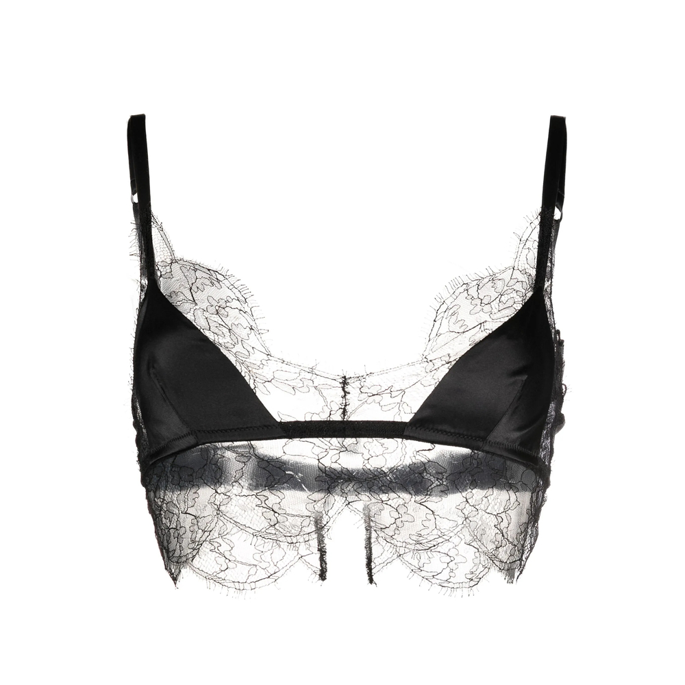 black silk blend satin weave Chantilly lace triangle cup adjustable spaghetti straps rear hook and eye fastening scallop edge