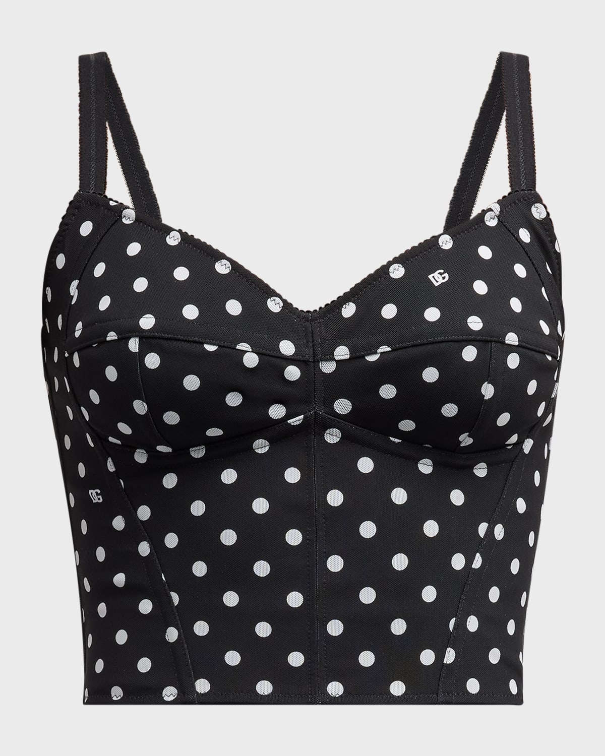 Dolceamp;Gabbana marquisette bustier top featuring DG logo polka dot print and a solid elastic back panel Sweetheart neckline Sleeveless; adjustable straps Fitted Cropped length Back zip Nylon/polyamide/spandex Made in Italy