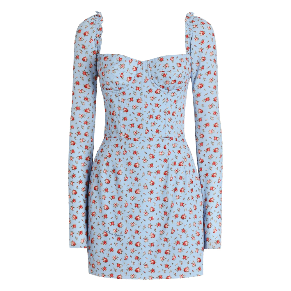 sky blue floral print square neck long sleeves ruched shoulders corset detail