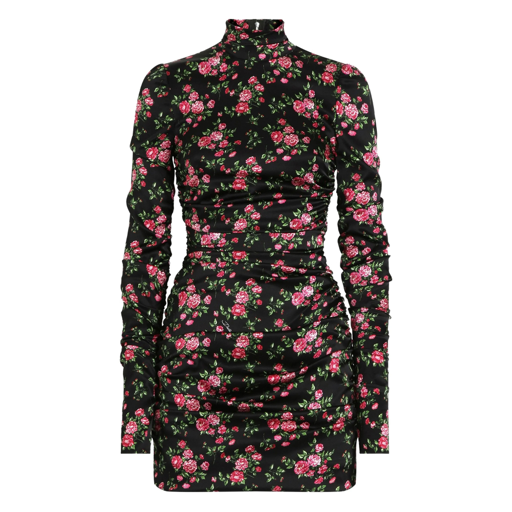 black floral print long sleeves high neck ruched detail