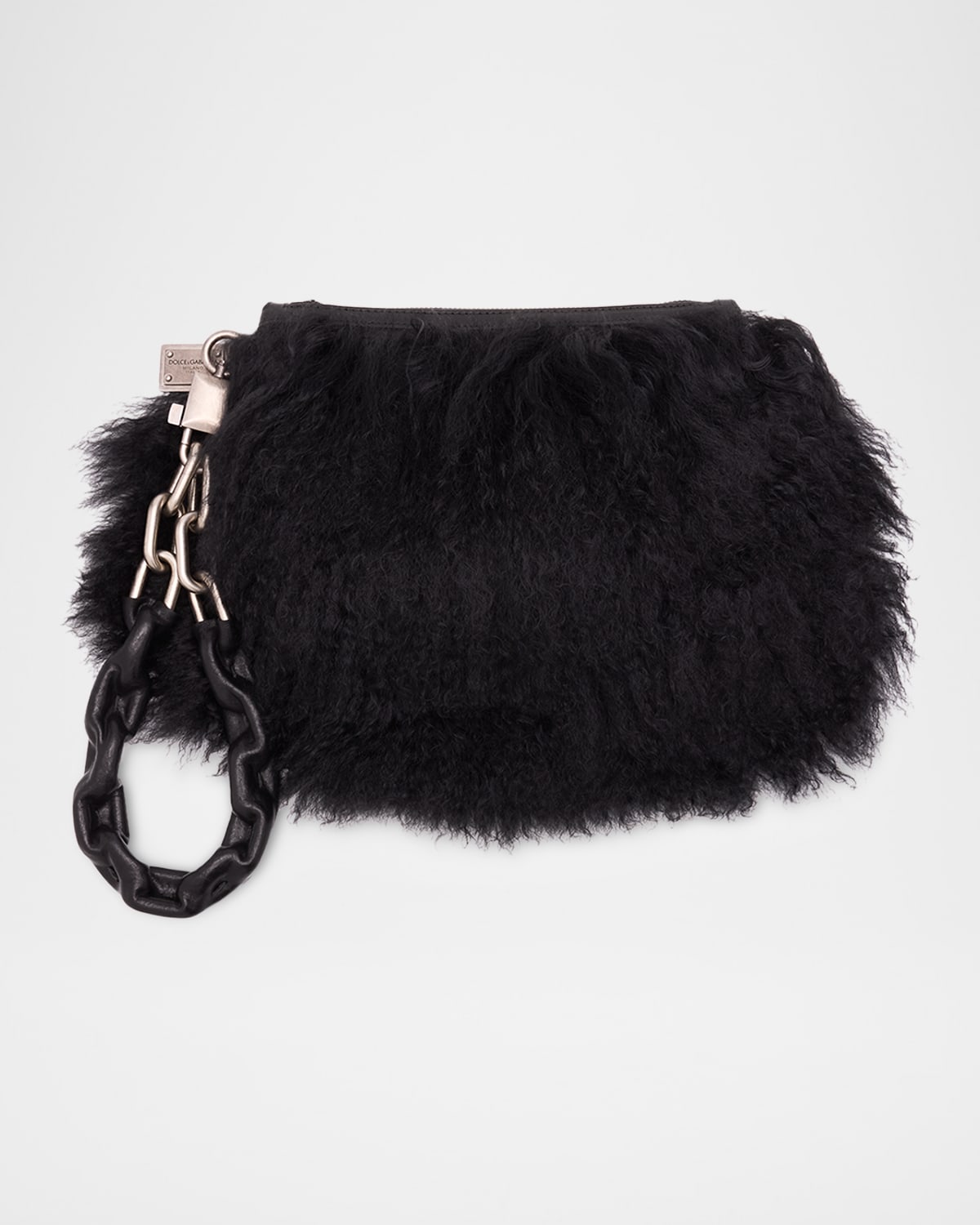 Dolceamp;Gabbana clutch bag in bleached and dyed shearling (Italy), finished with smooth leather Detachable covered chain wristlet strap Zip top closure Interior, one card slot Approx. 5.5"H x 10"W x 1"D Made in Italy