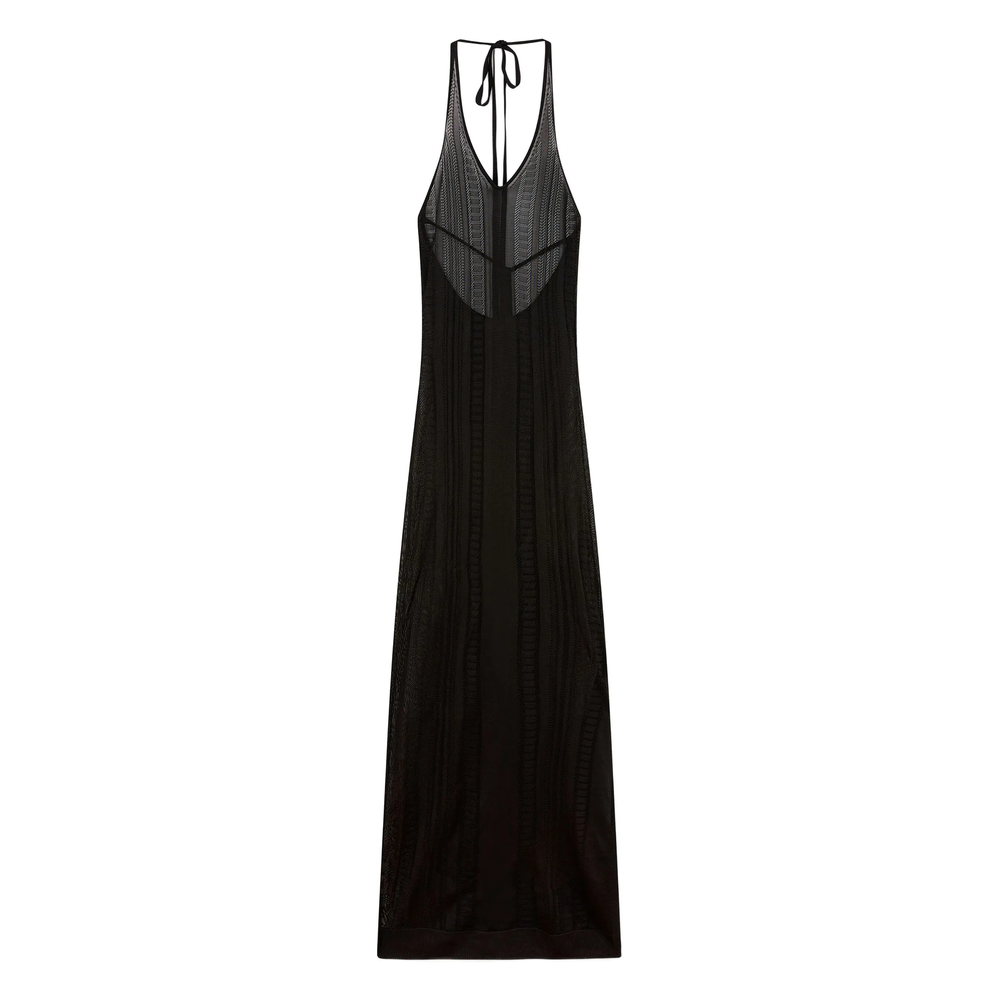 black halterneck tie fastening open back semi-sheer construction floor-length