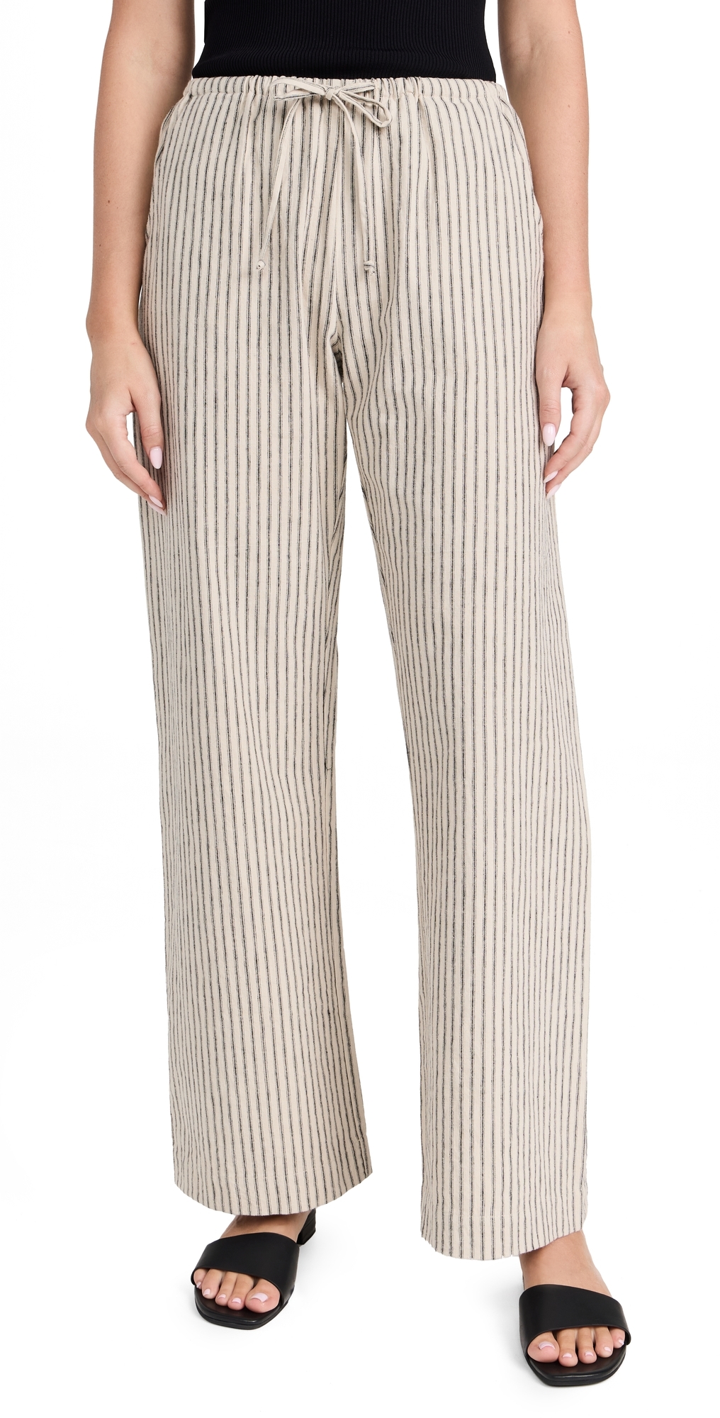 Fabric: Mid-weight, non-stretch linen weave. Stripe pattern. Covered elastic waist with drawstring. On-seam hip pockets. Shell: 55% linen/45% cotton. Wash cold. Made in the USA. Measurements: Measurements from size S Rise: 10.25in / 26cm Inseam: 30.25in / 77cm Leg opening: 21.25in / 54cm