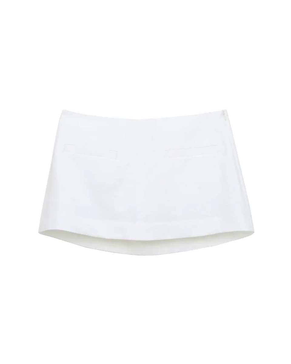 The Summer Cruise Skirt in Pure White by Dorothee Schumacher is a micro mini skirt with integrated shorts crafted in a technical linen with welt pockets and drapes slightly longer in the back. 59% Polyester, 41% Linen #251-940105-100