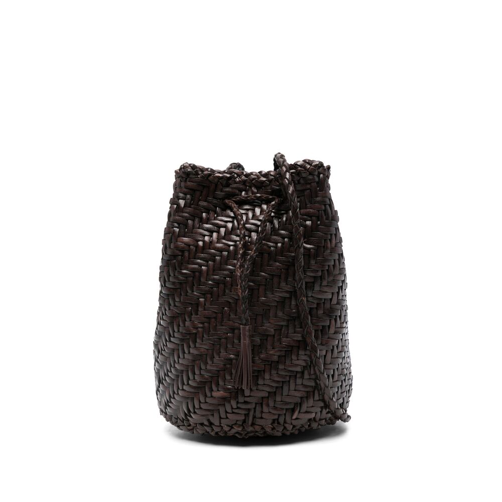 coffee brown leather interwoven design bucket body tassel detail single braided shoulder strap main compartment logo charm drawstring fastening