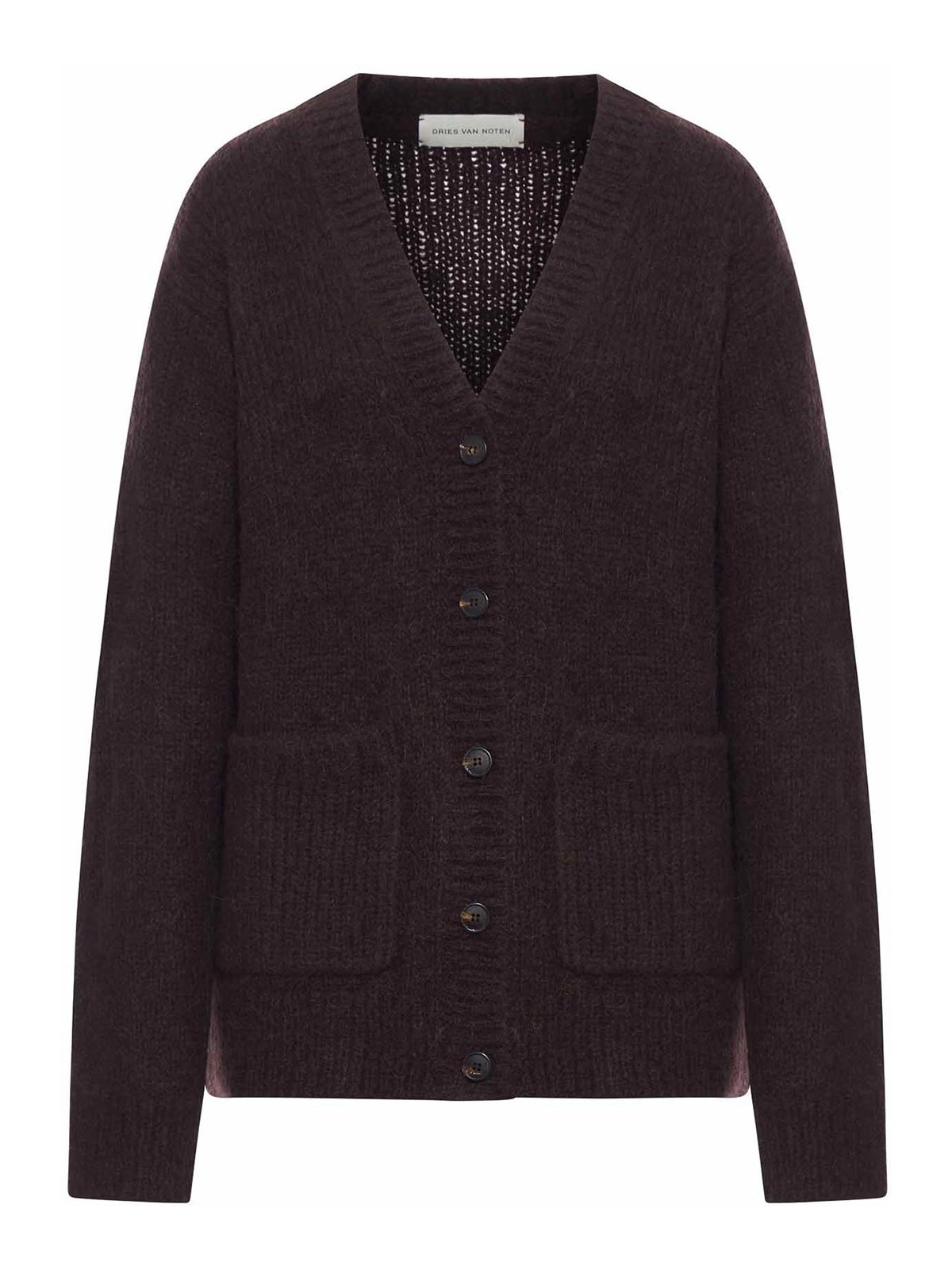 Encolure en V avec boutons en V, manches longues, deux poches plaquées, bords côtelés, ourlet droit, marron