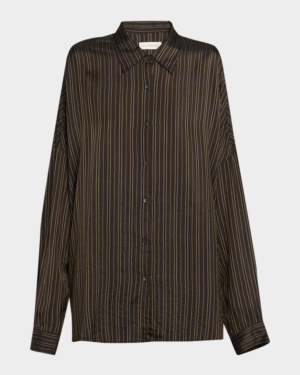 Designed with a multistriped pattern, the "Casia" blouse by Dries Van Noten is crafted with a lightly crinkled finish for added texture Shirt collar; button front Dropped shoulders Long sleeves; button cuffs Yoked back Oversized fit Hip length Cotton Made in Hungary