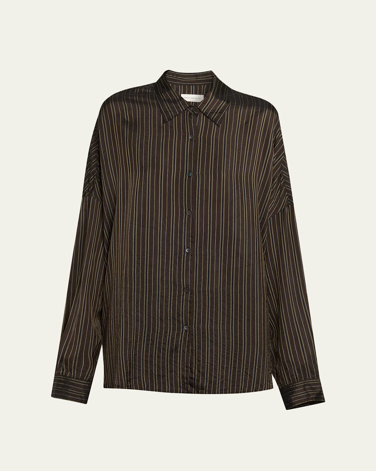 Designed with a multistriped pattern, the "Casia" blouse by Dries Van Noten is crafted with a lightly crinkled finish for added texture Shirt collar; button front Dropped shoulders Long sleeves; button cuffs Yoked back Oversized fit Hip length Cotton Made in Hungary